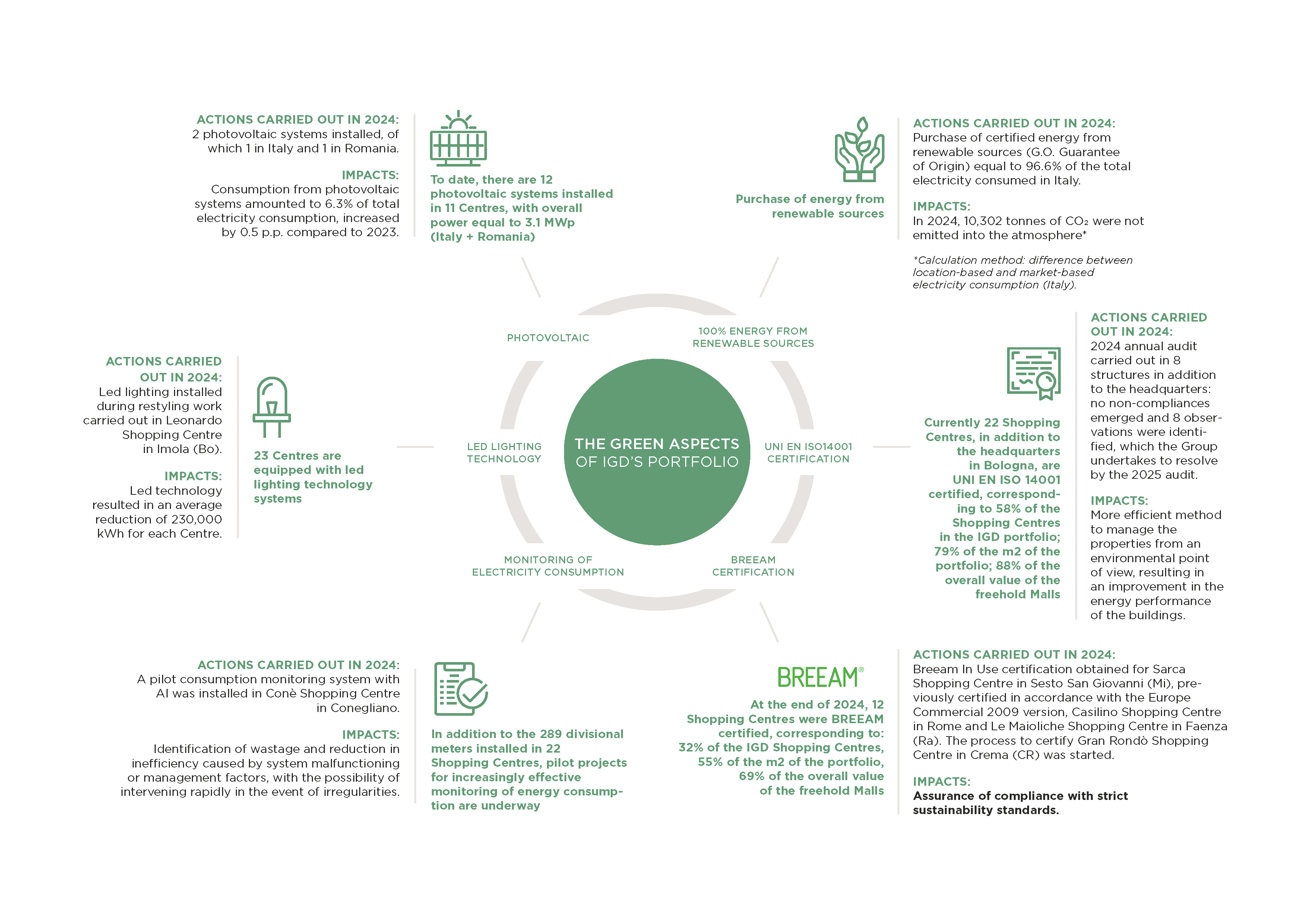 In 2024, thanks to the significant energy improvement actions carried out on the assets (both structural and management), IGD’s energy consumption (which includes electricity consumption, district heating and cooling and fuels) in Italy and Romania recorded a decrease compared to 2023
